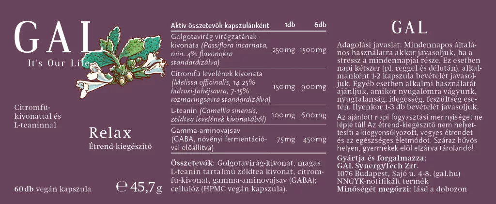 Az egészséges táplálkozás, jó alvás, vitaminok és ásványianyagok, testmozgás, rendszeres meditálás, imádkozás, relaxációs gyakorlatok, pszichoterápia mind sokat segíthetnek. Szerencsére ezek mellett vannak olyan természetes hatóanyagok, gyógynövénykivonatok is, amelyek szintén hatékonyak a krónikus és akut stressz, idegesség, szorongás ellen, és hosszútávon is szedhetőek, sőt, sokszor egyéb előnyös hatásaik is vannak (pl. alvás segítése, anélkül, hogy nappali szedése álmosítana, antioxidáns hatás). Ide tartozik többek közt a citromfű, az L-teanin nevű speciális zöld tea-félékből származó aminosav is, ahogy a golgotavirág és a különböző élelmiszerekben és speciális zöld tea-félékben megtalálható gamma-aminovajsav (GABA) is. Relax termékünkben ezeket kombináltuk az egymást jól kiegészítő, szinergista hatásuk miatt. Közös bennük, hogy mindegyik fokozza a nyugtató hatású GABA neurotranszmitter szintjét és hatását az agyban, de mindegyik más-más mechanizmuson keresztül. Ez azért is érdekes, mert a közvetlenül szedett GABA nehezen jut át a vér-agy-gáton (bár ettől még közvetett módon, a perifériás idegrendszerre való hatásán keresztül a szájon át szedett GABA is hathat az agyra, központi idegrendszerre). A felsorolt összetevőknek e fontos GABA-rendszer javítása tehát közös jellemzője, de mivel különböző módon érik el, így pusztán a GABA-szintet növelő hatásukban is kiegészítik egymást. Már emiatt is jó ötlet kombinálni őket, azonban mindegyiknek megvannak a GABA-szint növelésén túl is az egyedi hatásaik (dopaminra, szerotoninra, acetil-kolinra, agyhullámokra és kortizolra gyakorolt hatásuk), amelyek révén nemcsak erősítik, hanem ki is egészítik egymás hatását (szinergia). A cél egy olyan termék kifejlesztése volt, ami nappal szedve nem okoz álmosságot, de nyugtat és oldja a stresszt, szorongást, csökkenti az izgatottságot. Lássuk részletesen az összetevőket és hatásaikat külön-külön:
