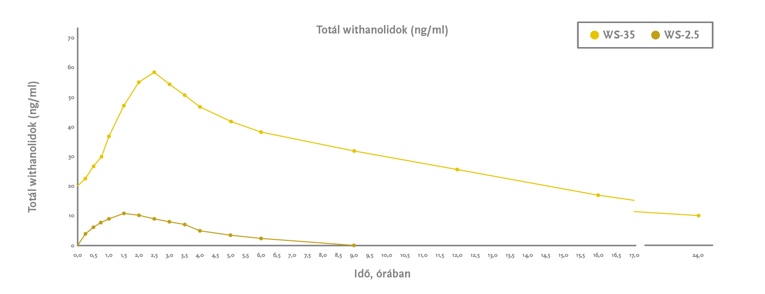 Az alábbi grafikon egy 2023-ban publikált biohasznosulási vizsgálatból van (11), és rajta az ashwagandha fő hatóanyagai, a withanolidok vérszintjének emelkedése látható. A sárga görbe a Shoden® bevétele utáni vérszintet mutatja, míg a barna görbe egy hagyományos ashwagandha-kivonat utáni vérszintet. Az elfogyasztott hatóanyag (withanolidok) mennyisége azonos volt a két kivonat hatóanyagkoncentrációjától függetlenül (tehát az alacsonyabb hatóanyagkoncentrációjú, hagyományos kivonatból több lett elfogyasztva). Látható, hogy mennyivel magasabb vérszintet ért el a Shoden®, és mennyivel tovább maradt magasan a szintje: még 24 óra után is jelentős szint volt, míg a másik esetben már 8-9 óra után detektálási limit alá esett. (És bár meg nem oszthatjuk, de elmondhatjuk, hogy a KSM-66® azonosan teljesített, mint a hagyományos ashwagandha-kivonat, azaz megegyezett a görbéje a sárga görbével, míg a Sensoril® kb. 2x magasabb withanolid-vérszintet okozott, azaz kb. 2x jobb volt a biohasznosulása, mint a KSM-66®-nak, de töredékét érte csak el a Shoden®-ének).