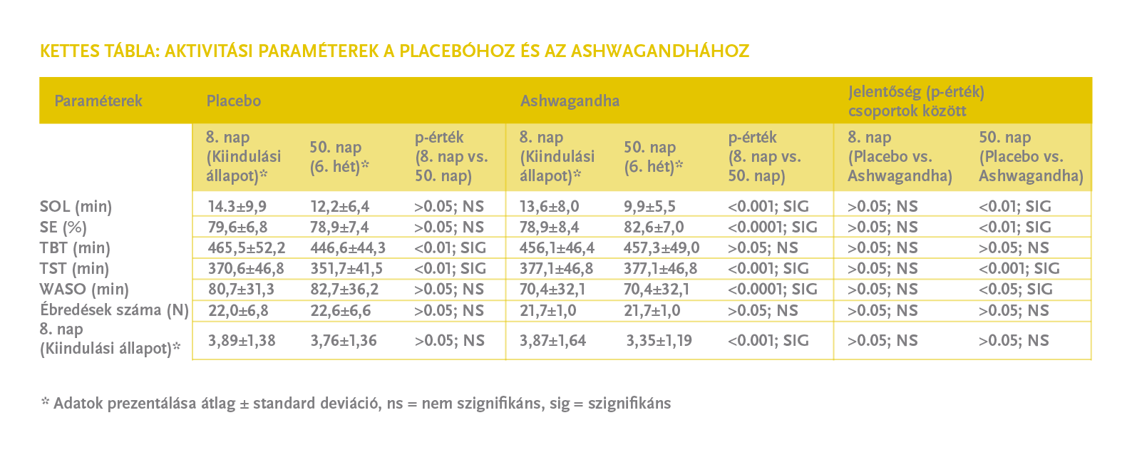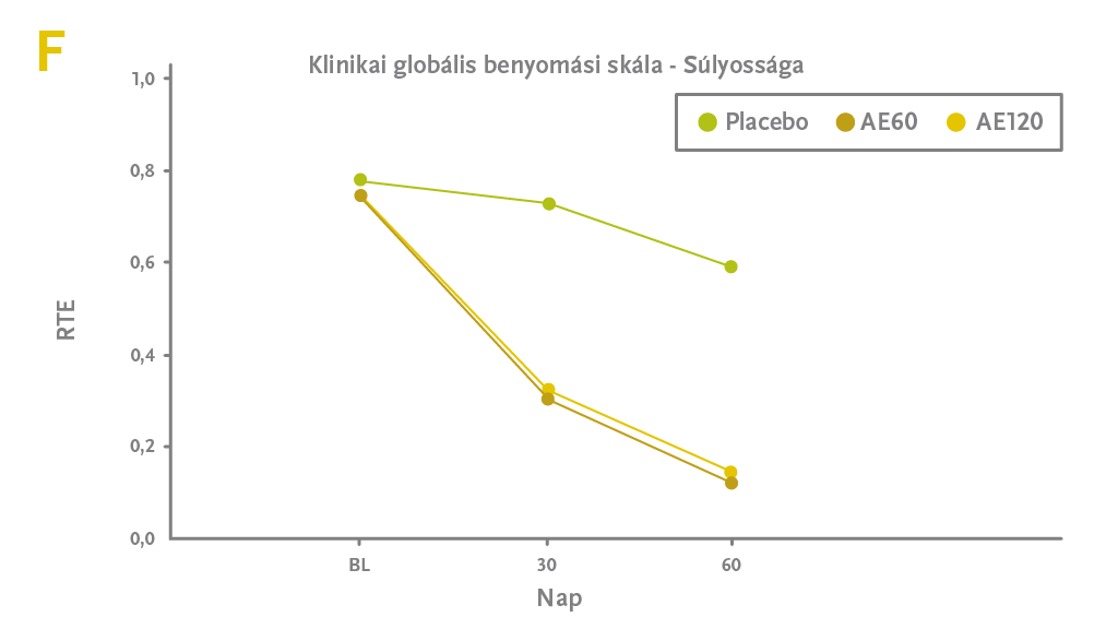 Mindkettőt 2019-ben publikálták. (1,4) Az egyikben 240mg Shoden®-t vagy placebot kaptak az alanyok 60 napon át, de ezt a nagy dózist este, vacsora után vették be és nem reggel. Talán ez lehetett az oka, hogy bár az előbb bemutatott vizsgálathoz hasonló eredménye volt, a jóval nagyobb dózis ellenére sem nagyobb, hanem valamivel kisebb mértékű volt a javulás. (4)
