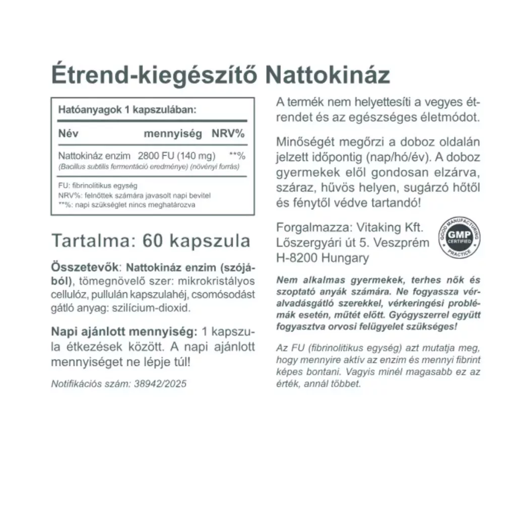 A Vitaking Nattokináz természetes fermentációval (Bacillus subtilis fermentáció) ) előállított enzim amelynek aktivitása 2800 FU kapszulánként.