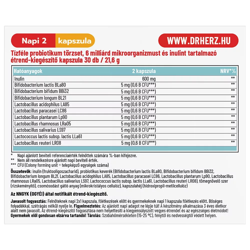Összetevők: inulin (fruktooligoszacharid), probiotikus keverék (Bifidobacterium lactis BLa80, Bifidobacterium bifidum BBi32, Bifidobacterium longum BL21, Lactobacillus acidophilus LA85, Lactobacillus paracasei LC86, Lactobacillus plantarum Lp90, Lactobacillus rhamnosus LRa05, Lactobacillus salivarius LS97, Lactococcus lactis subsp. lactis LLa61, Lactobacillus reuteri LR08), tömegnövelő szer (rizskeményítő), csomósodást gátló anyag (mikrokristályos cellulóz), kapszulahéj (hidroxipropil-metilcellulóz)