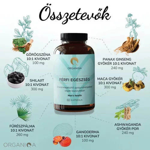 shilajit kivonat, maca gyökér kivonat, fűrészpálma kivonat, ashwagandha gyökér por, panax ginseng gyökér kivonat, ganoderma kivonat, görögszéna kivonat